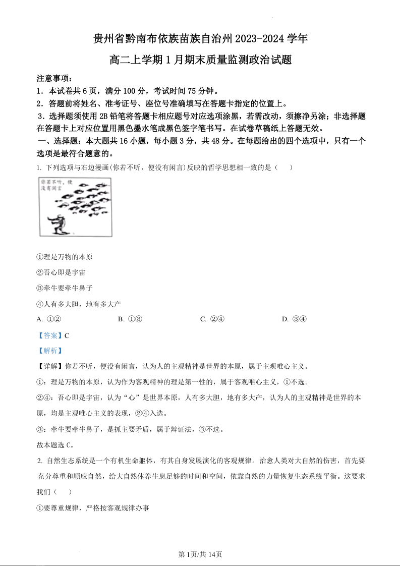 贵州省黔南州2023-2024学年高二上学期期末质量监测政治(精品解析版)