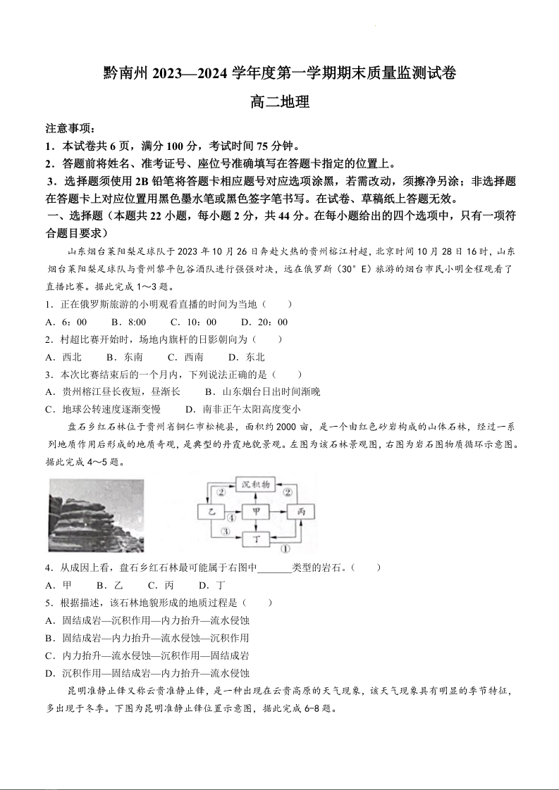 贵州省黔南州2023-2024学年高二上学期期末质量监测地理