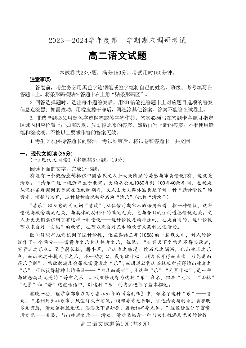 河北省保定市2023-2024学年高二上学期期末调研考试语文
