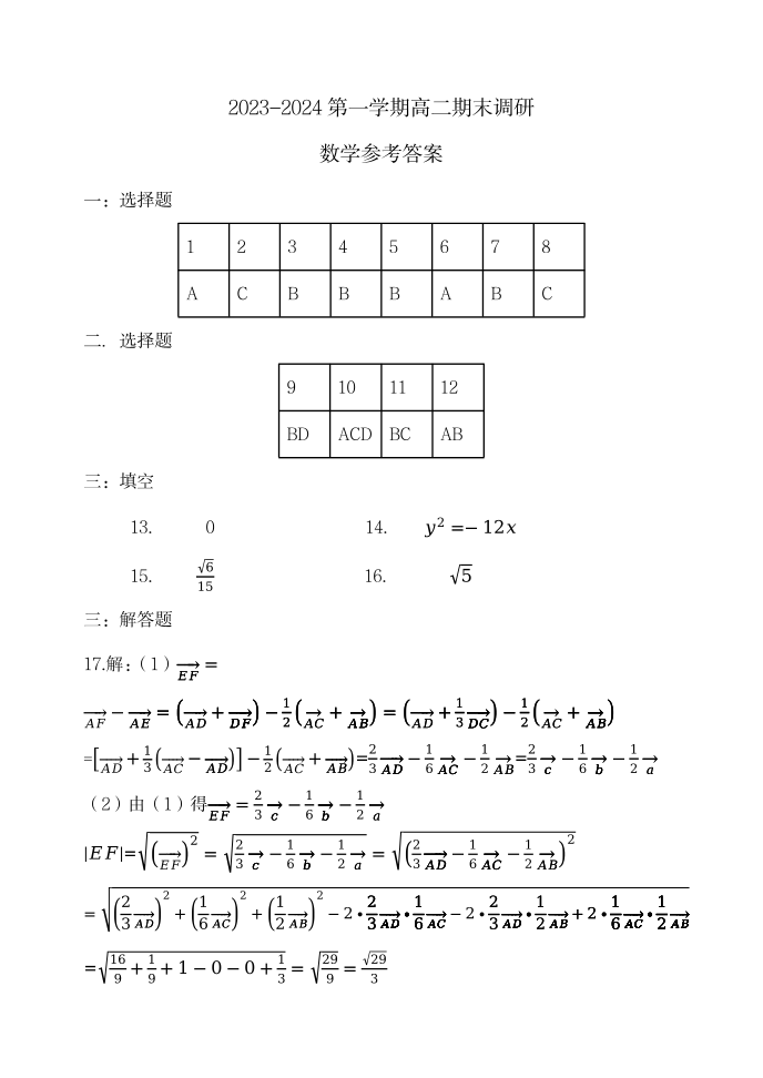 河北省保定市2023-2024学年高二上学期期末调研考试数学答案