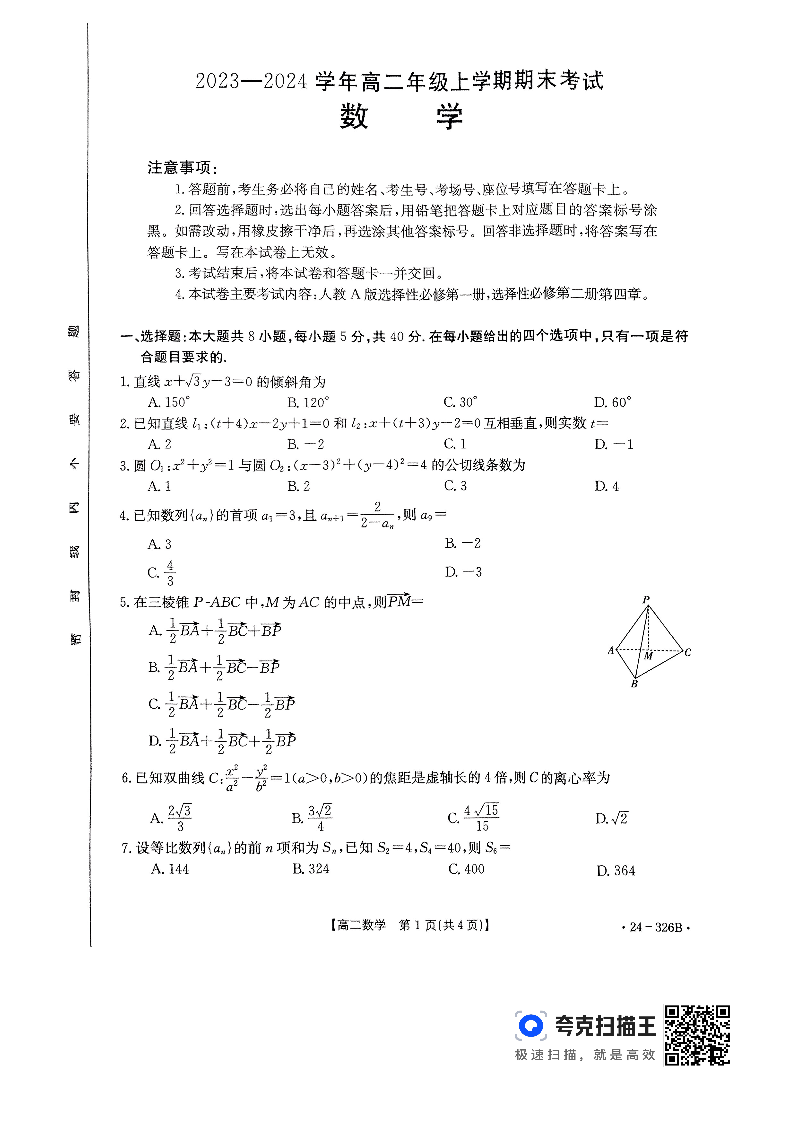 河北省保定市定州市2023-2024学年高二上学期1月期末考试数学