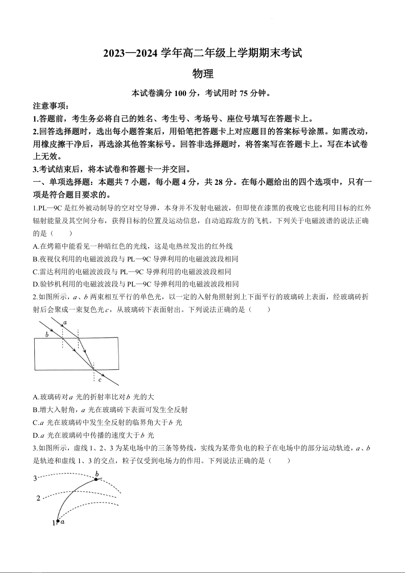 河北省保定市定州市2023-2024学年高二上学期1月期末考试物理+答案