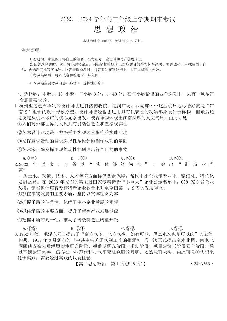 河北省保定市定州市2023-2024学年高二上学期1月期末考试政治
