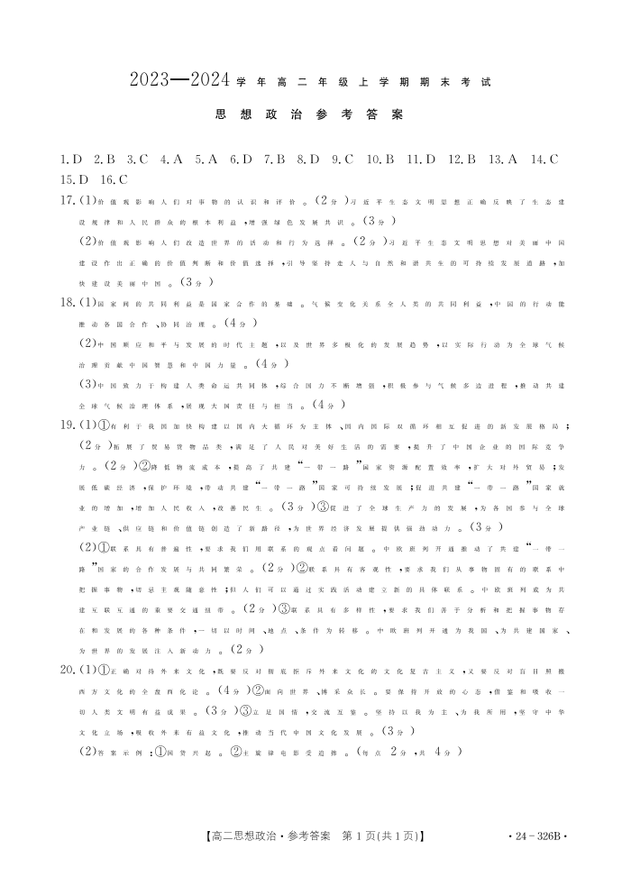 河北省保定市定州市2023-2024学年高二上学期1月期末考试政治答案