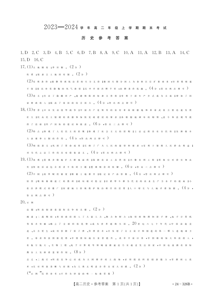 河北省保定市定州市2023-2024学年高二上学期1月期末考试历史答案