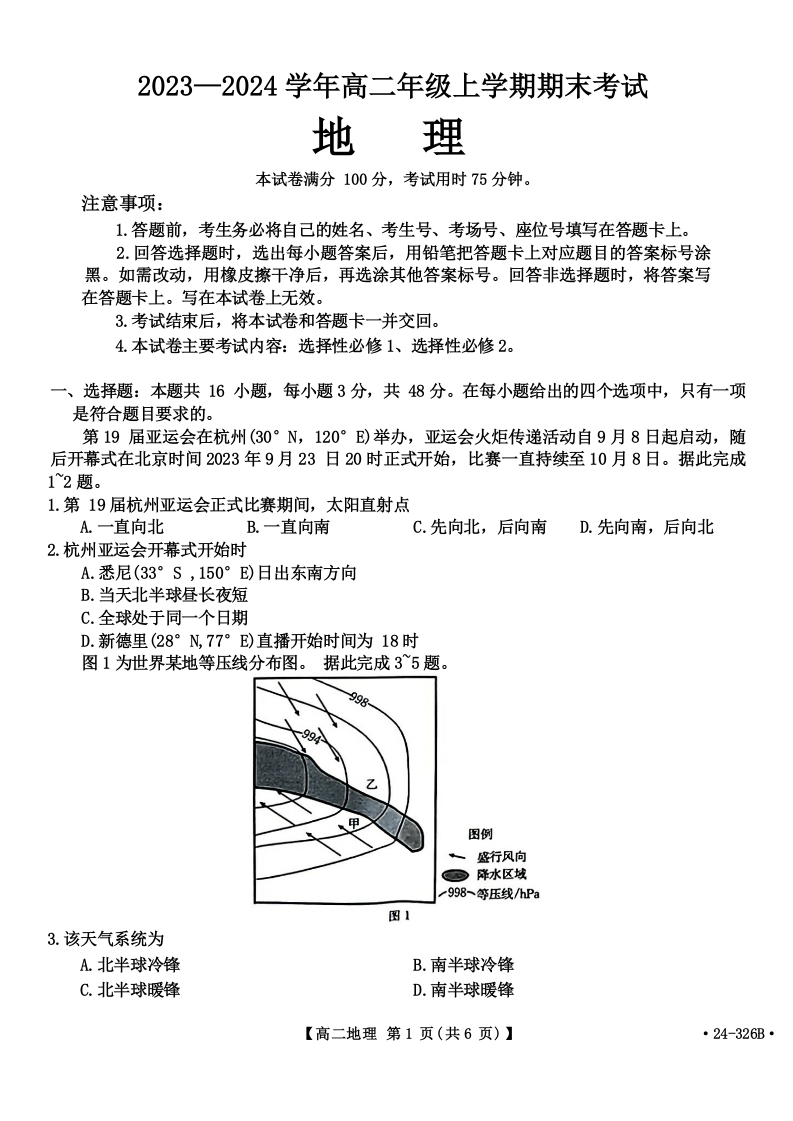 河北省保定市定州市2023-2024学年高二上学期1月期末考试地理