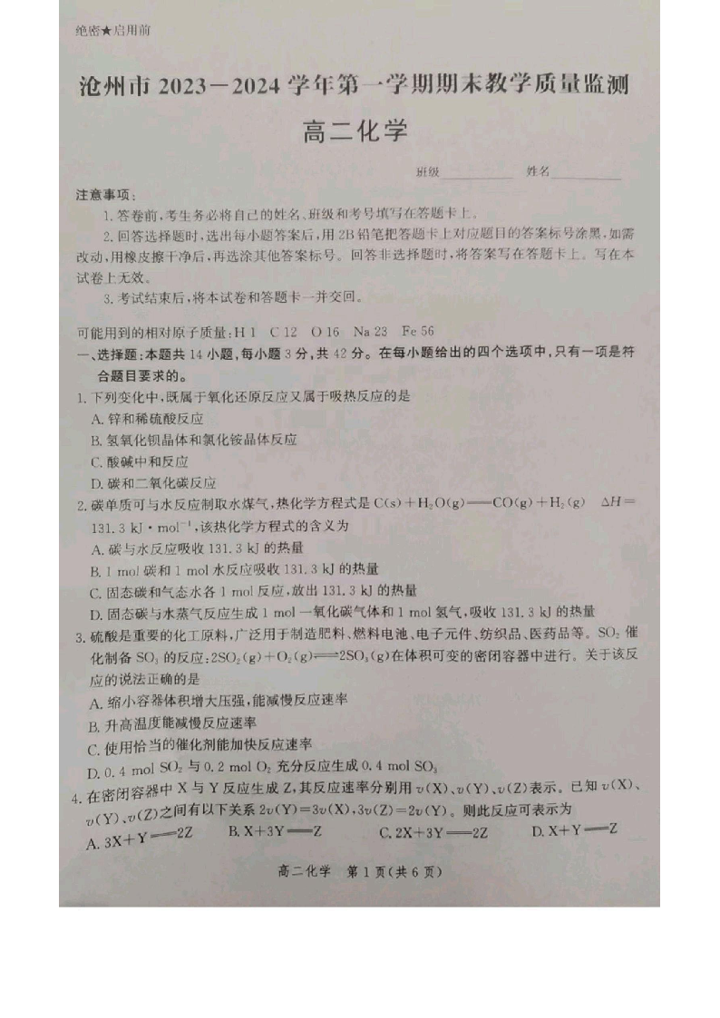 河北省沧州市八县联考2023-2024学年高二上学期1月期末考试化学