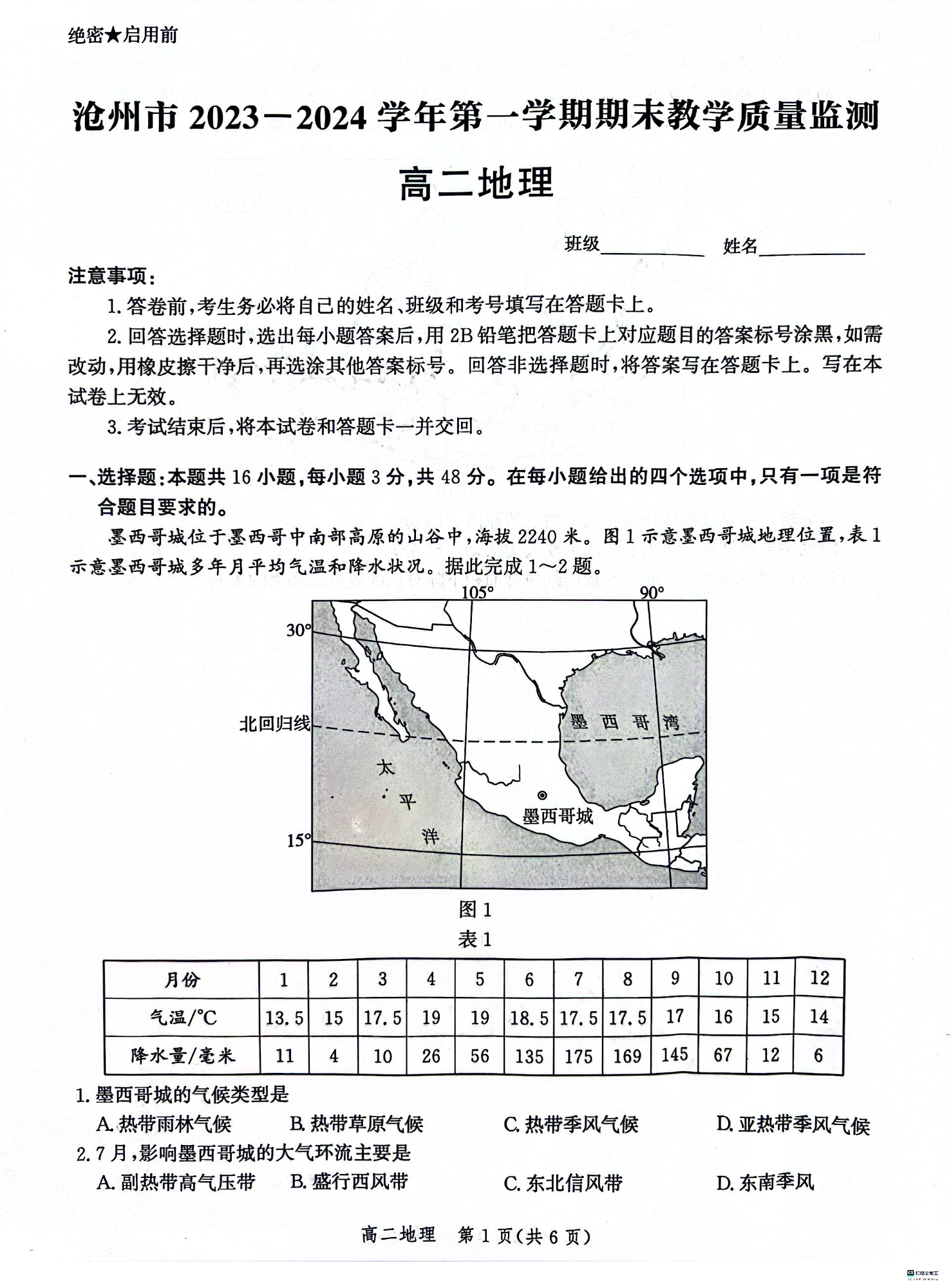 河北省沧州市八县联考2023-2024学年高二上学期1月期末考试地理+答案