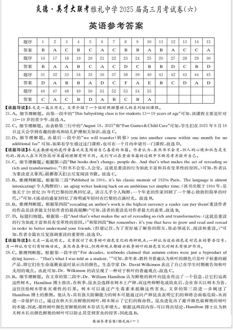湖南省长沙市雅礼中学2025年2月高三月考(六)英语答案