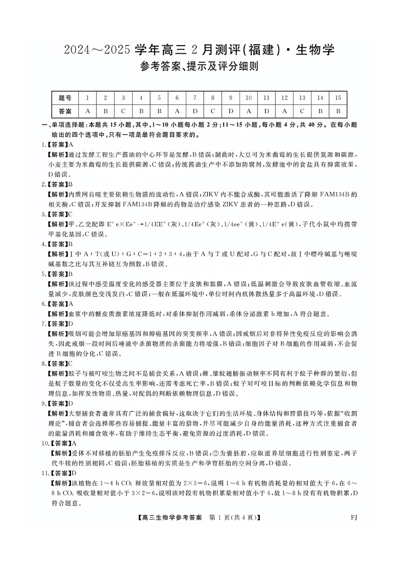 福建省金科大联考2025届高三2月开学联考生物答案