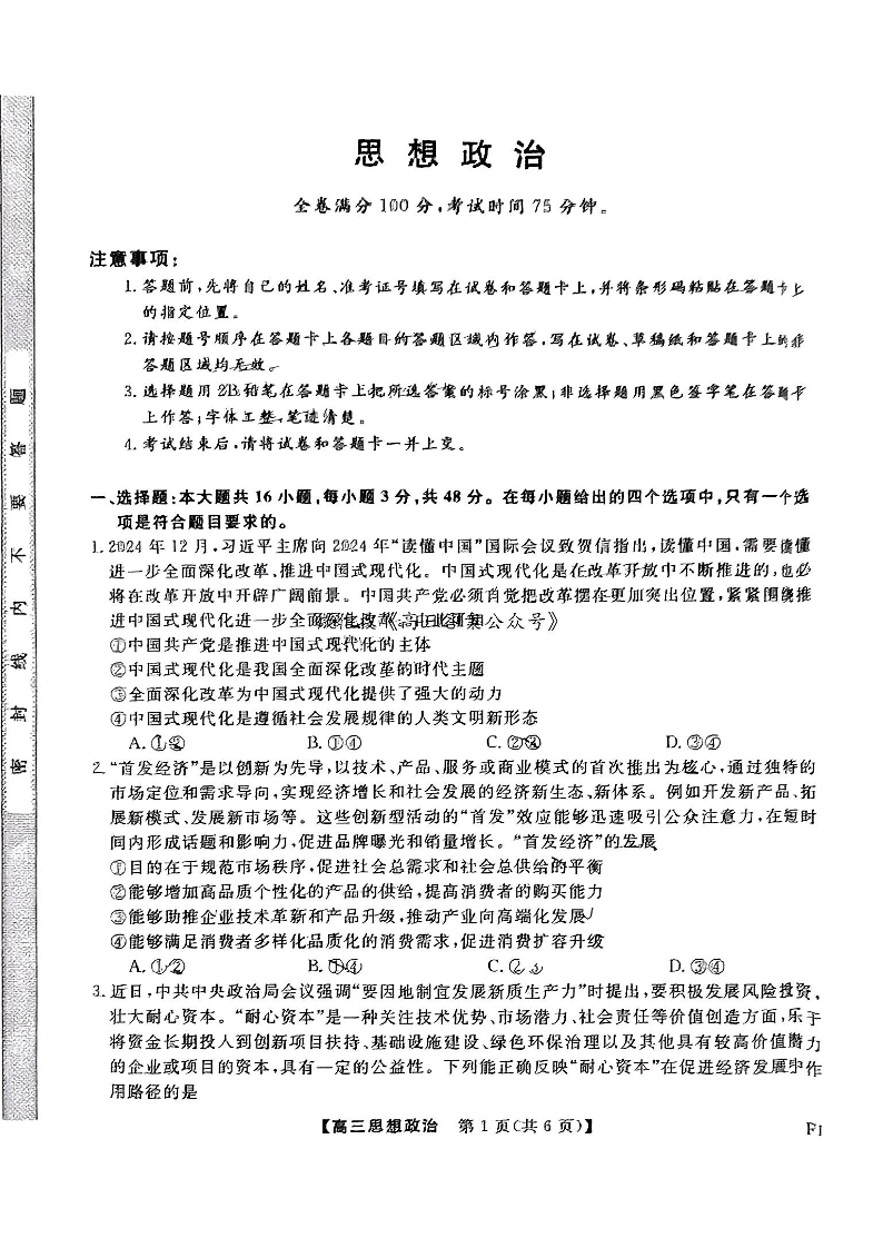 福建省金科大联考2025届高三2月开学联考政治