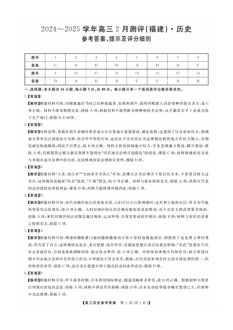 福建省金科大联考2025届高三2月开学联考历史答案