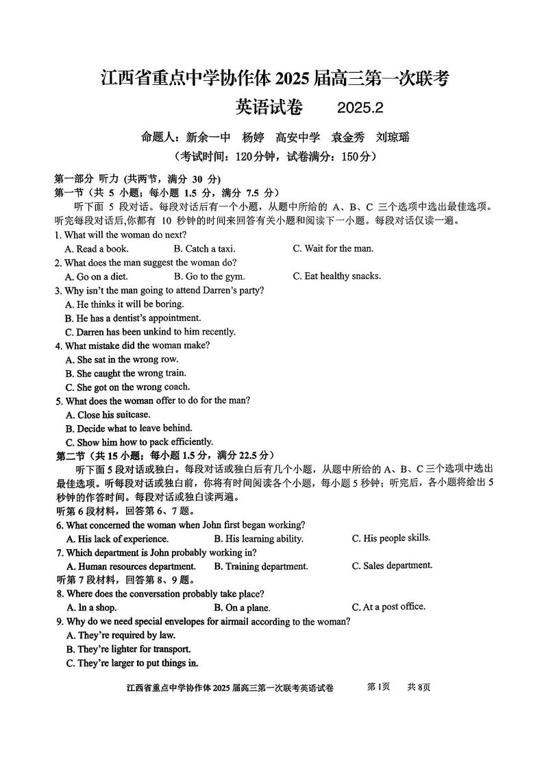 江西省重点中学协作体2025届高三下学期第一次联考英语+答案