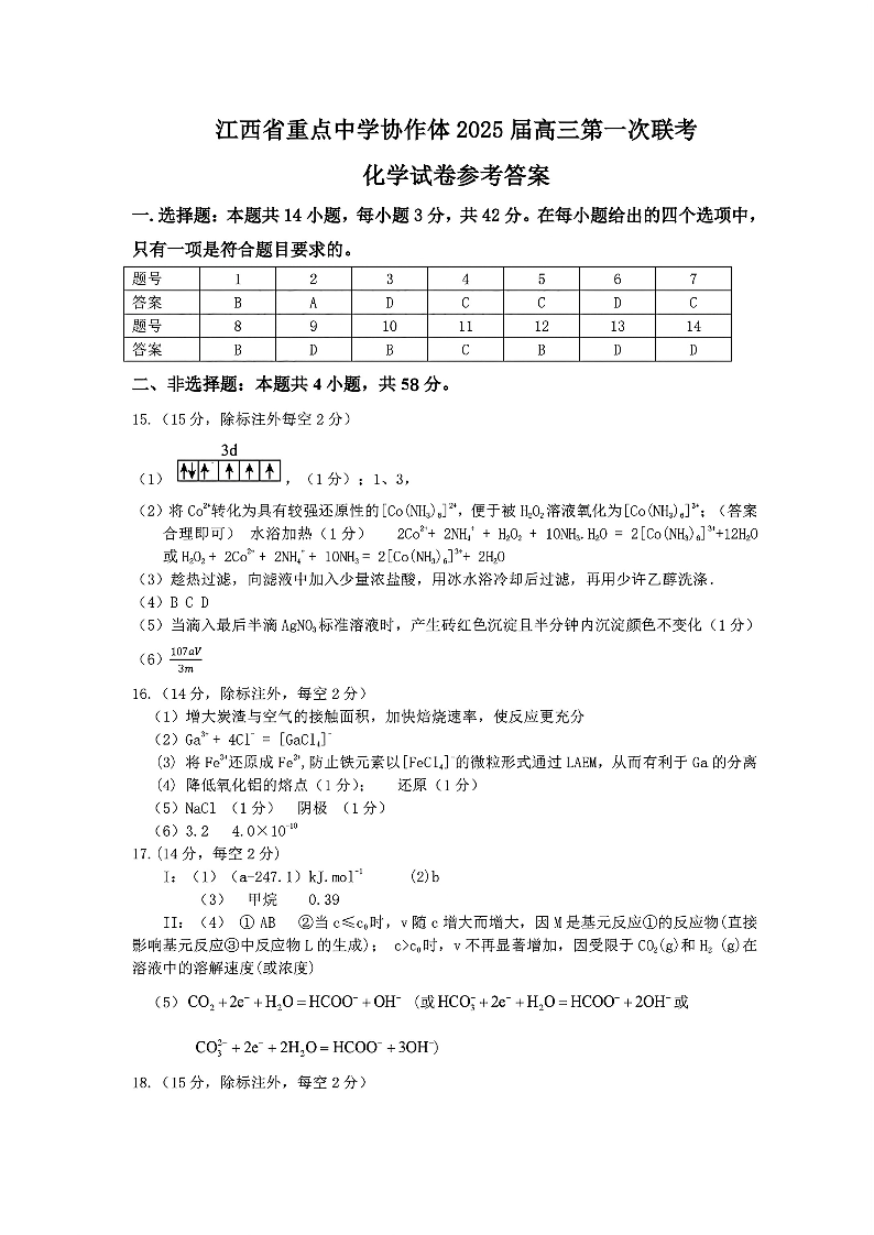 重庆八中2025届高三下学期2月入学适应性训练化学答案