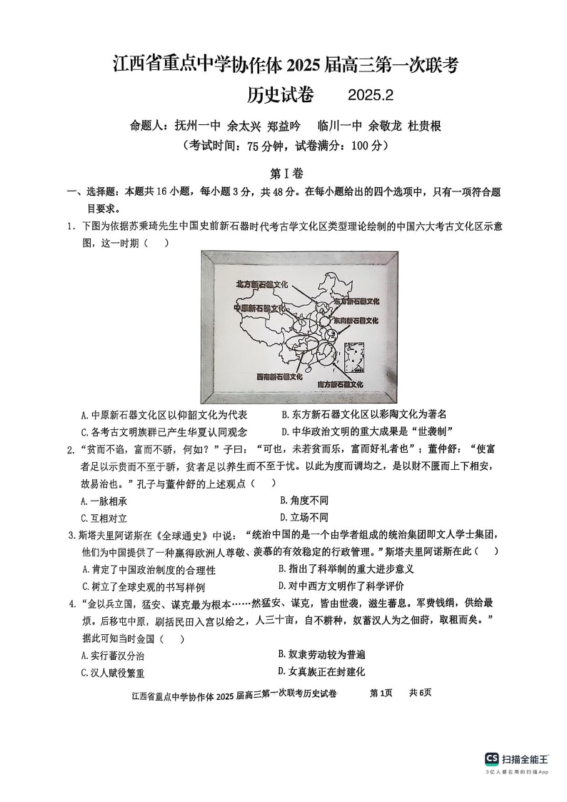 江西省重点中学协作体2025届高三下学期第一次联考历史+答案