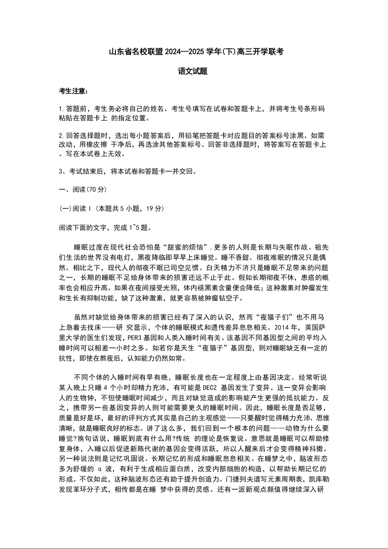 山东省“天一大联考·齐鲁名校教研共同体2025届高三年级开学质量检测语文+答案