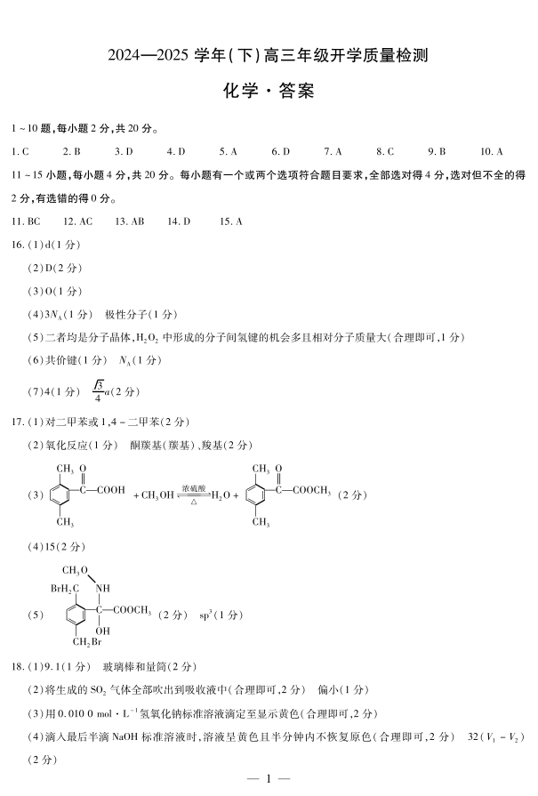 山东省“天一大联考·齐鲁名校教研共同体2025届高三年级开学质量检测化学答案