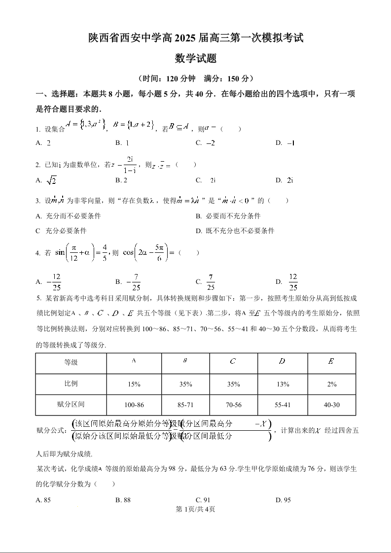陕西省西安中学2025届高三下学期第一次模拟考试数学