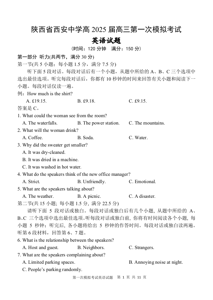 陕西省西安中学2025届高三下学期第一次模拟考试英语