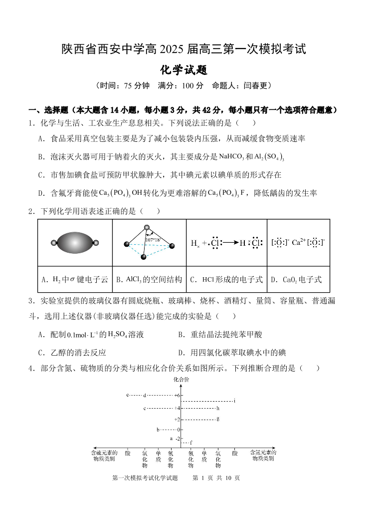 陕西省西安中学2025届高三下学期第一次模拟考试化学