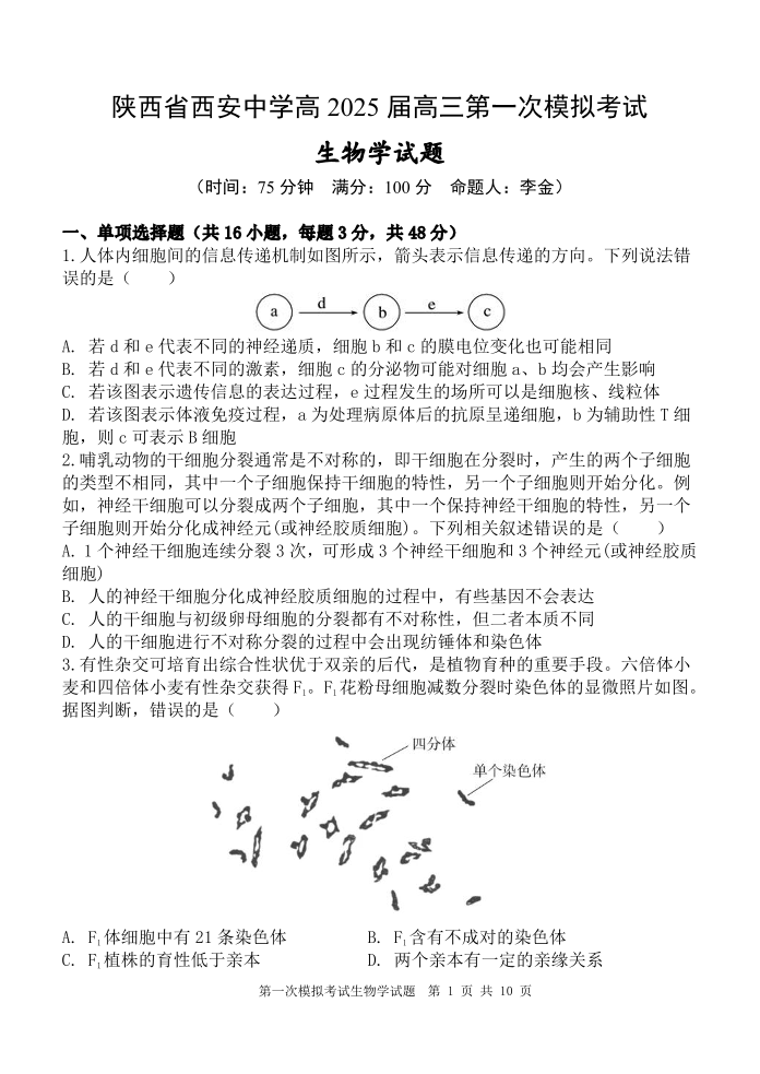 陕西省西安中学2025届高三下学期第一次模拟考试生物