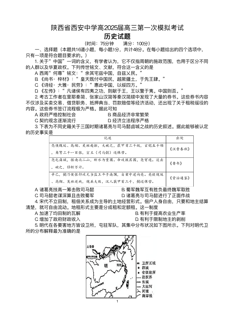 陕西省西安中学2025届高三下学期第一次模拟考试历史+答案