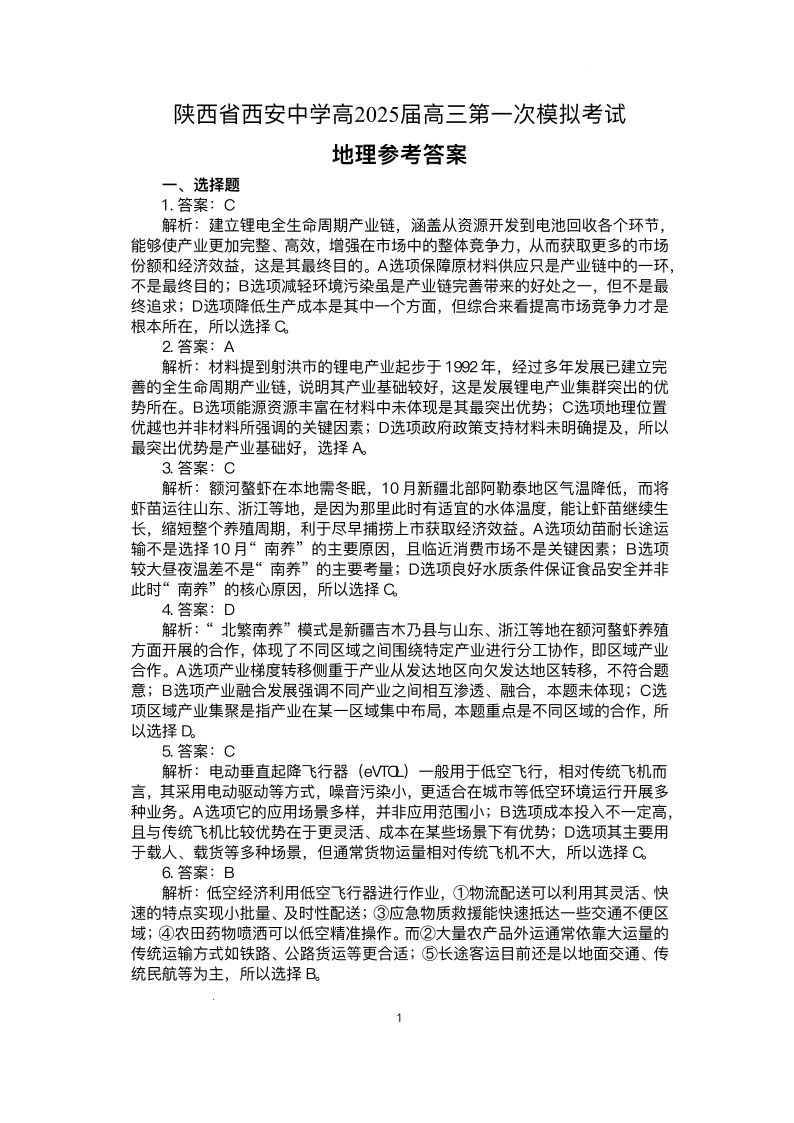 陕西省西安中学2025届高三下学期第一次模拟考试地理答案