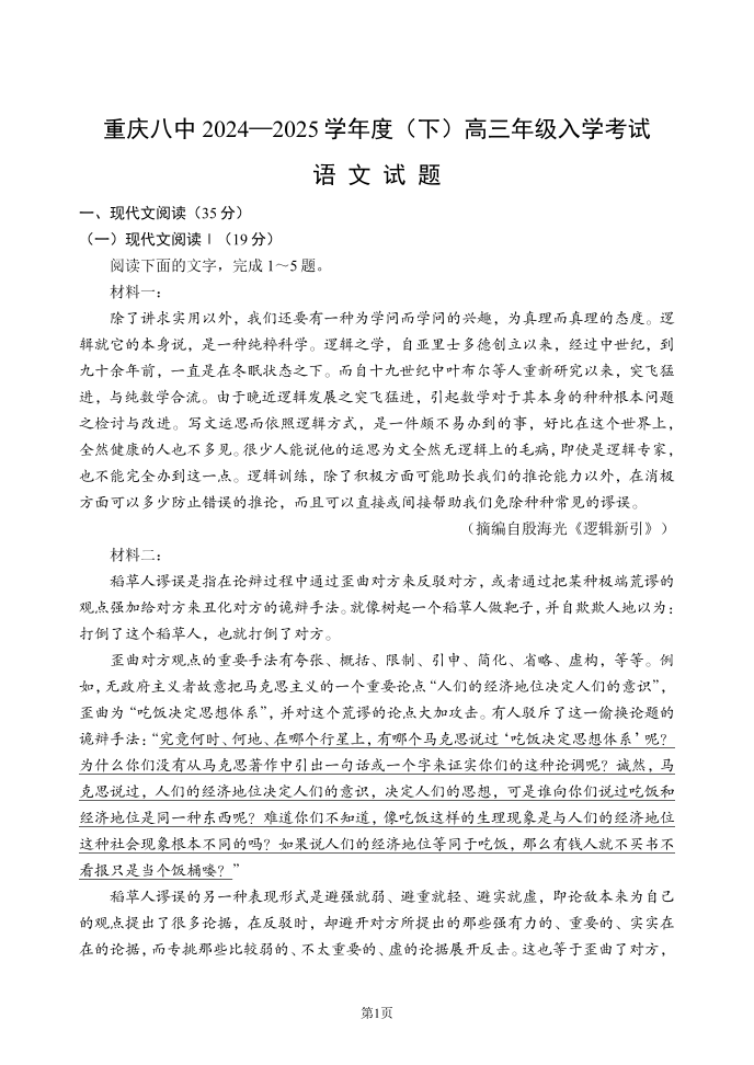 重庆八中2025届高三下学期2月入学适应性训练语文