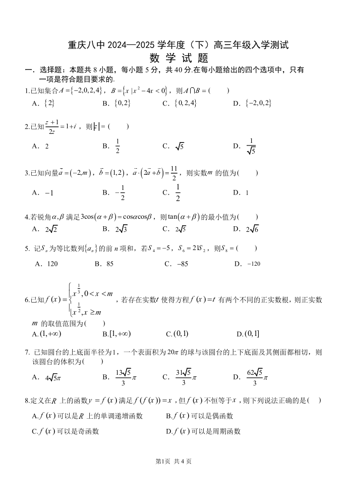 重庆八中2025届高三下学期2月入学适应性训练数学