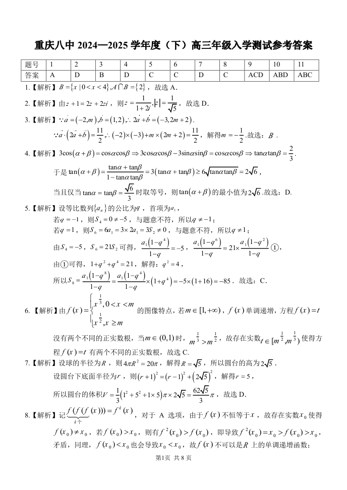 重庆八中2025届高三下学期2月入学适应性训练数学答案