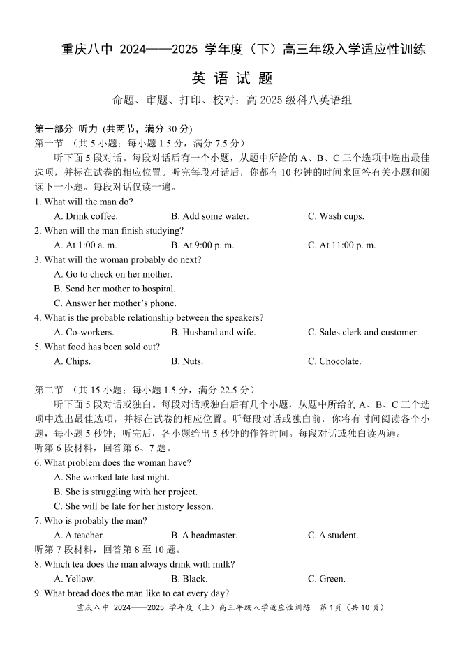 重庆八中2025届高三下学期2月入学适应性训练英语