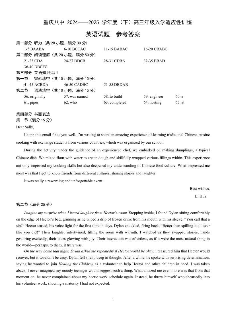 重庆八中2025届高三下学期2月入学适应性训练英语答案
