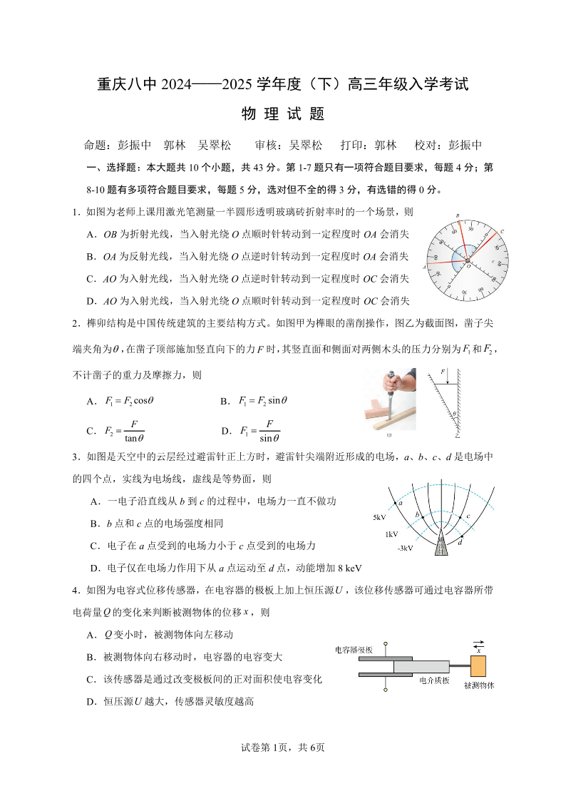 重庆八中2025届高三下学期2月入学适应性训练物理