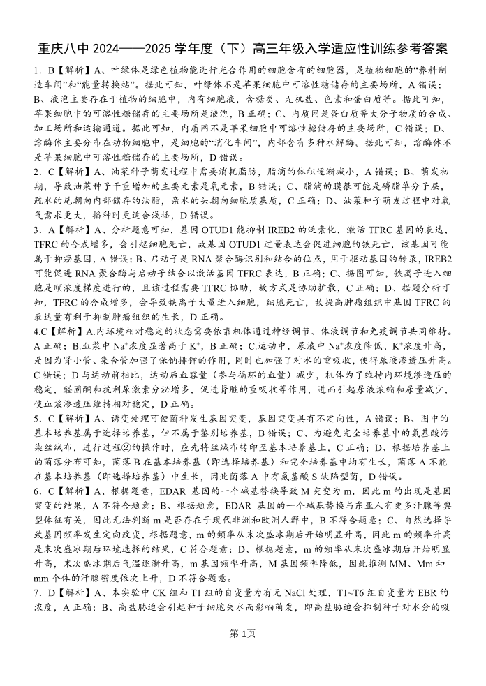 重庆八中2025届高三下学期2月入学适应性训练生物答案