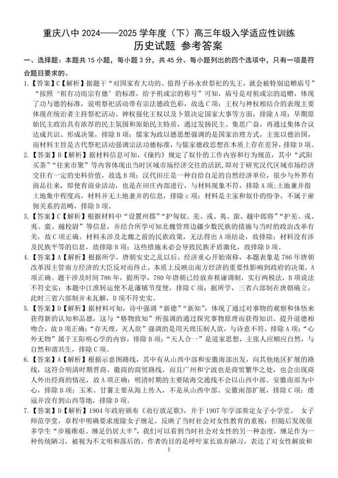 重庆八中2025届高三下学期2月入学适应性训练历史答案