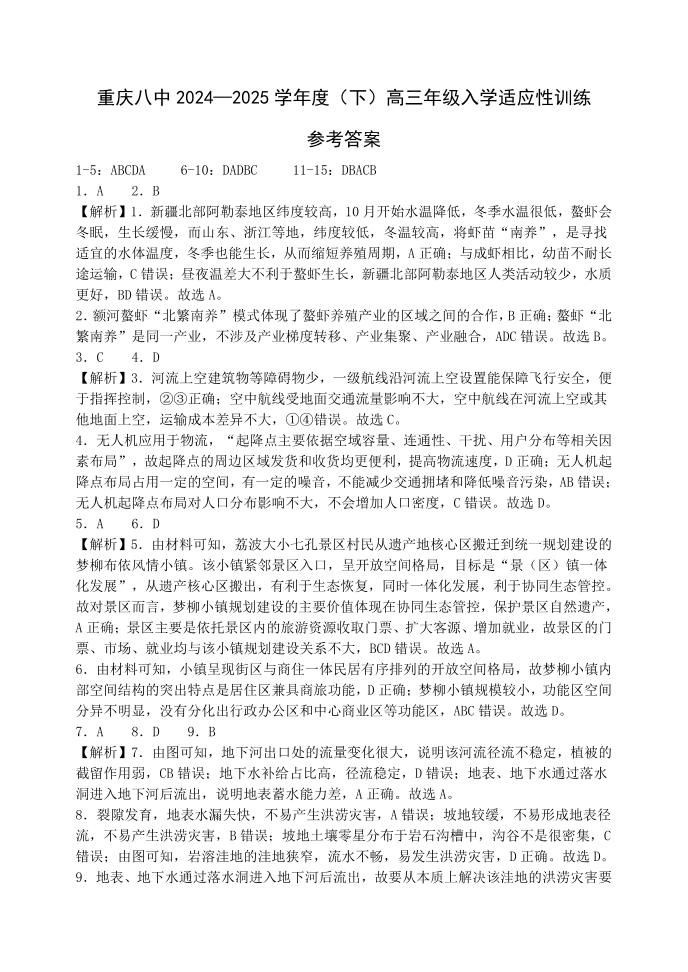 重庆八中2025届高三下学期2月入学适应性训练地理答案