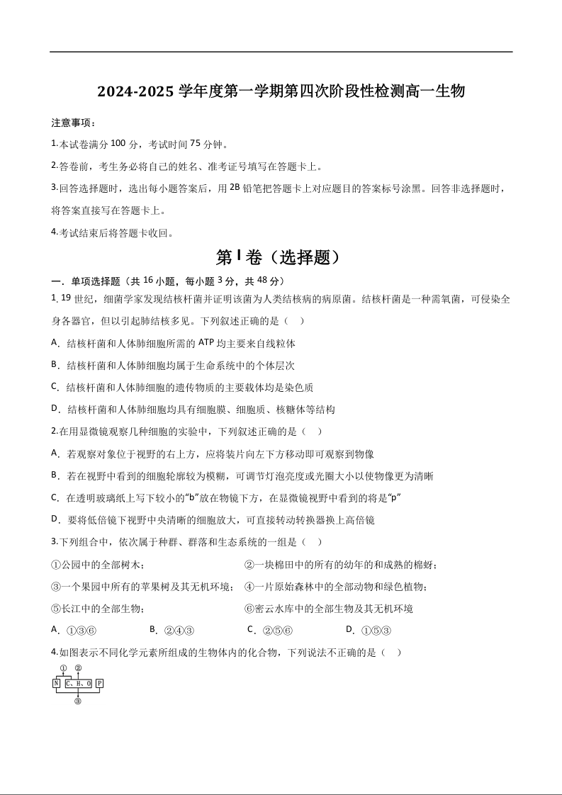 陕西省西安市区域2024-2025学年上学期高一第四次阶段性检测生物+答案