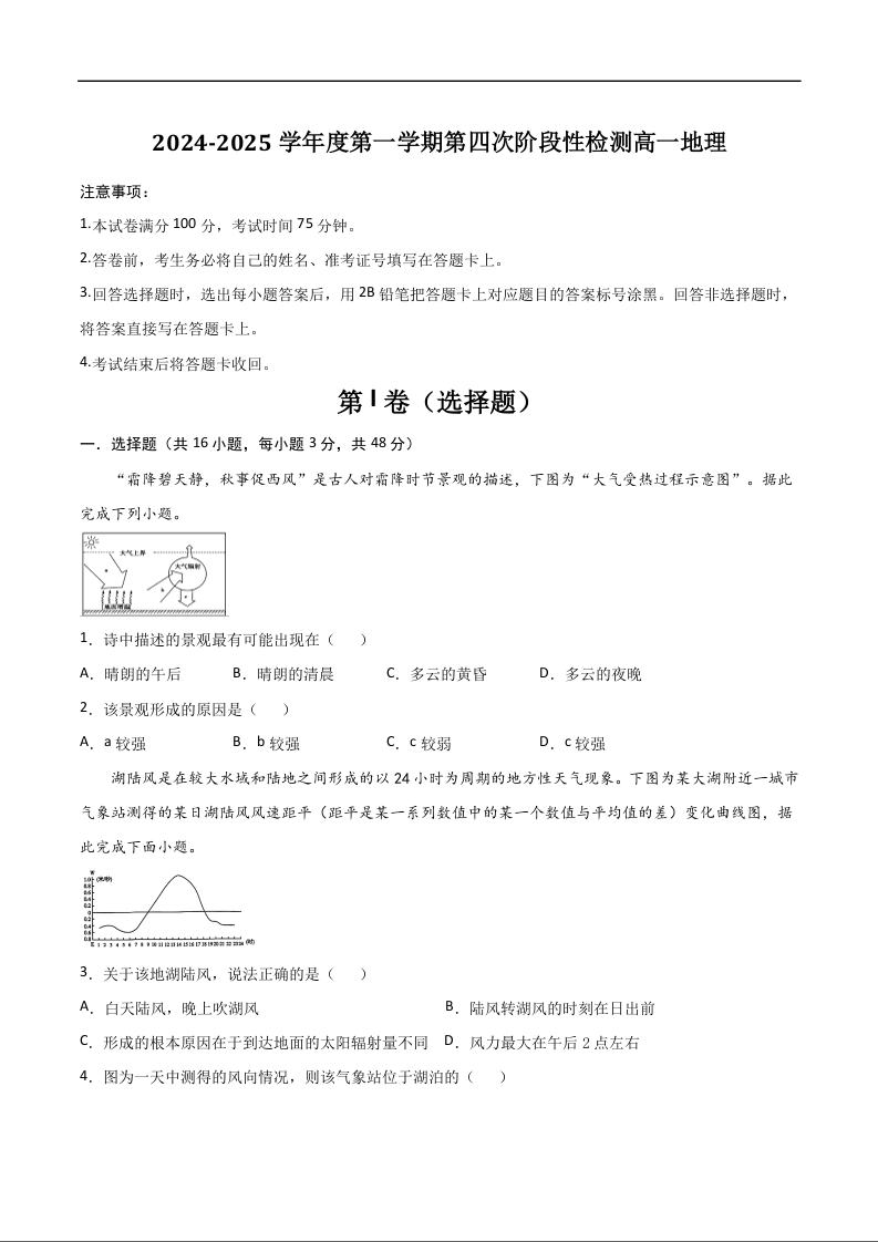 陕西省西安市区域2024-2025学年上学期高一第四次阶段性检测地理+答案