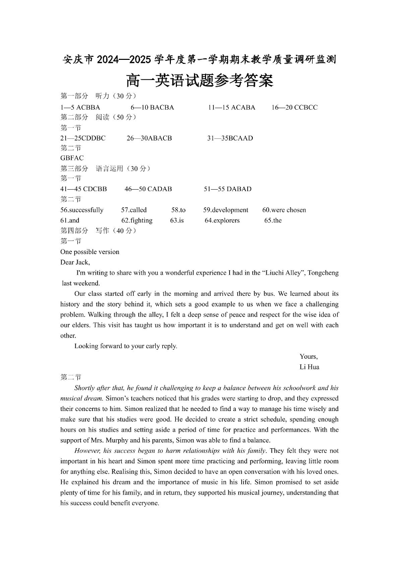 安徽省安庆市2024-2025学年上学期1月高一期末考试英语答案