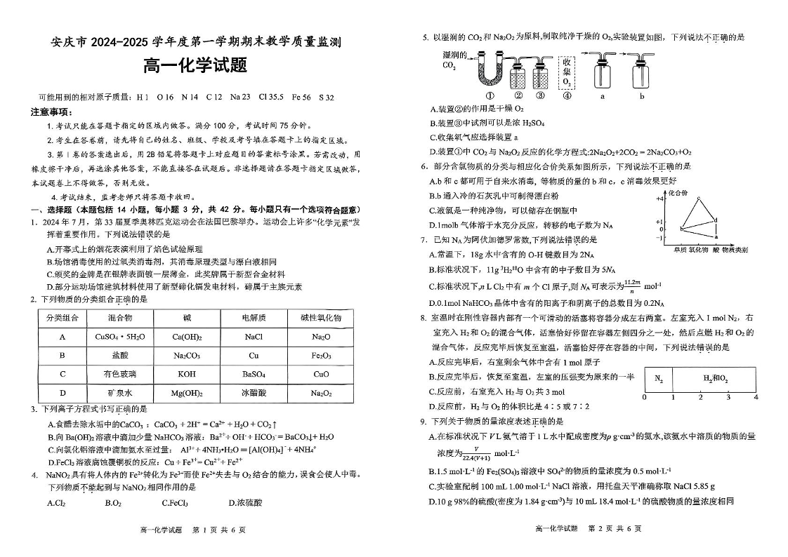 安徽省安庆市2024-2025学年高一上学期1月期末考试化学
