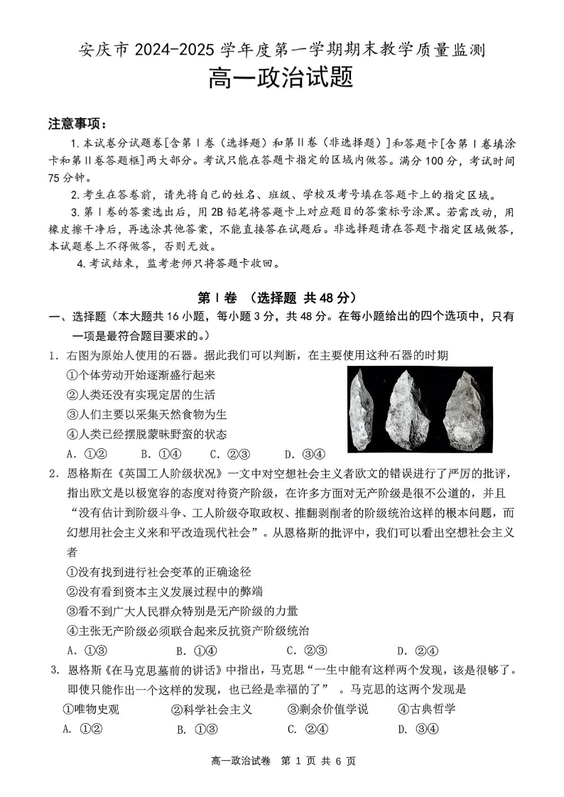 安徽省安庆市2024-2025学年上学期1月高一期末考试政治