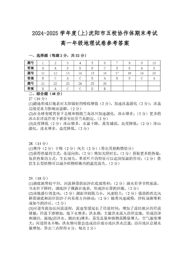 辽宁省沈阳市五校协作体2024-2025学年度上学期高一期末考试地理答案