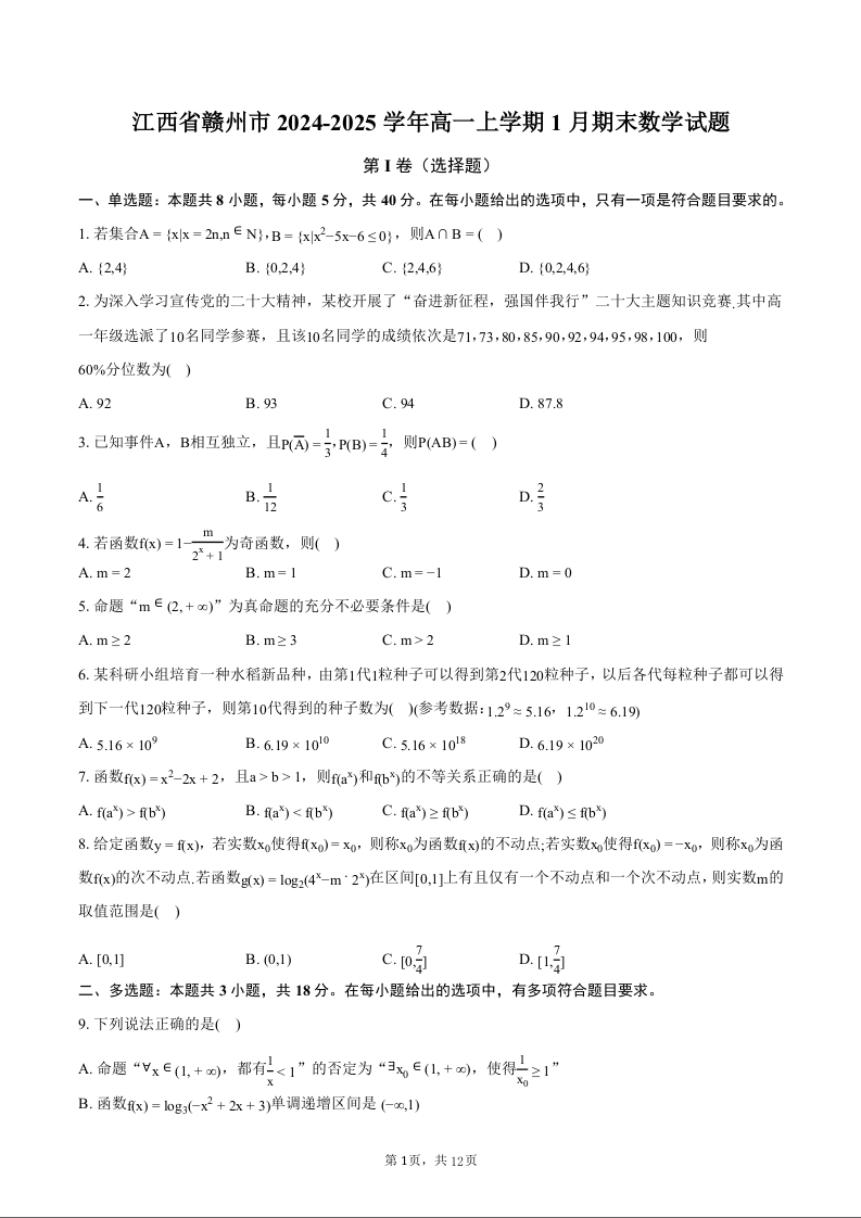 江西省赣州市2024-2025学年上学期1月高一期末考试数学+答案