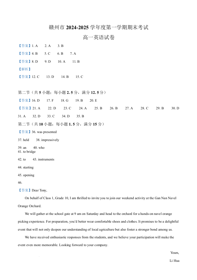 江西省赣州市2024-2025学年上学期1月高一期末考试英语答案