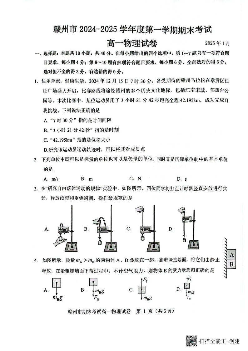 江西省赣州市2024-2025学年上学期1月高一期末考试物理