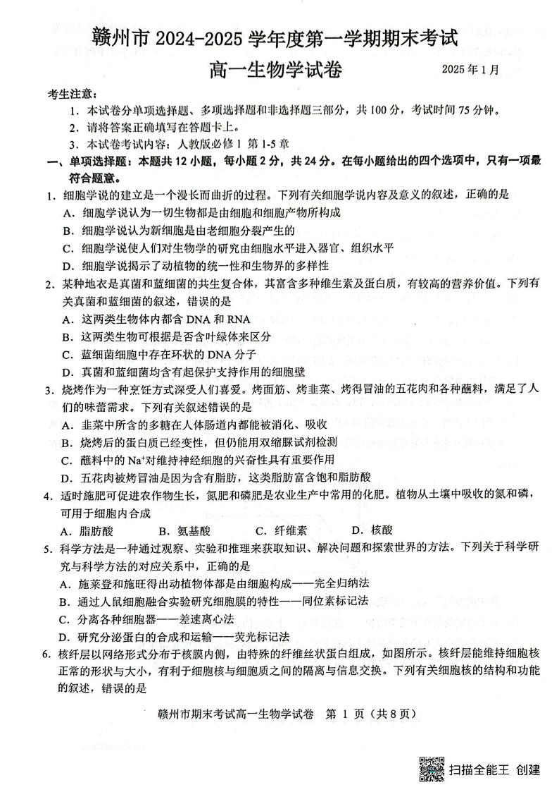 江西省赣州市2024-2025学年上学期1月高一期末考试生物