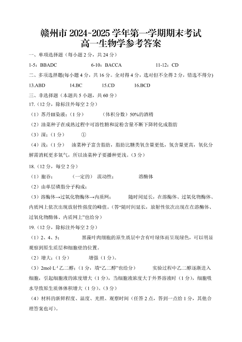 江西省赣州市2024-2025学年上学期1月高一期末考试生物答案