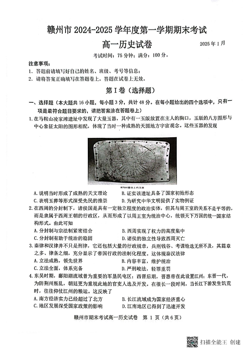 江西省赣州市2024-2025学年上学期1月高一期末考试历史