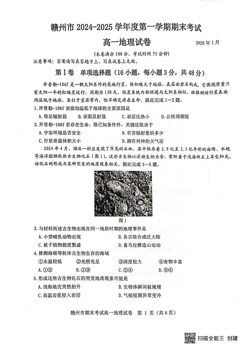江西省赣州市2024-2025学年上学期1月高一期末考试地理