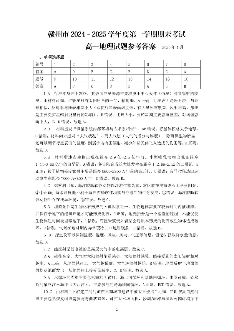 江西省赣州市2024-2025学年上学期1月高一期末考试地理答案